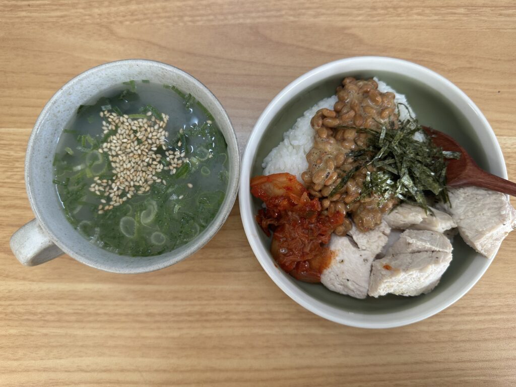 大体いつもこんな感じで、キムチのような副菜だけ日々変わるけど、納豆と鶏むねハムとごはん100gは固定されてる。